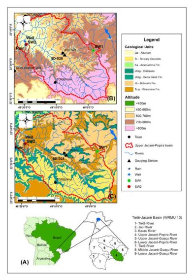 The Jacaré‐Pepira basin is located in the central region of São Paulo state (Brazil) draining an area of about 2,500 km2 in the upper portion of the Tietê‐Jacaré basin (Water Resources Management Unit 13 or UGRHI 13), and the main source of the river is located in the Serra de Itaqueri, at an approximate 960 meter of altitude. The geological framework of the Jacaré-Pepira River Basin is constituted predominantly by sandy clastic sediments of the Botucatu and Pirambóia Formations, covered by the basalts of the Serra Geral Formation of the Paraná Sedimentary Basin, both aged from Mezosoic. In addition to those units, it also has sedimentary rocks from the Bauru Group (Cretaceous age), sediments from Itaqueri Formation and related deposits (Cenozoic age) and quaternary aluvial sediments. At this basin is included a part of the Guarani Aquifer, which has 3,682.55 km² of outcrop area, it means 31.20% of the total area of the basin. And it is also included part of the Bauru Aquifer, which his outcrop corresponds 37% of the total area of the basin.
